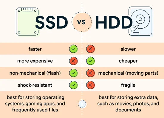 HDDs have moving parts while SSDs are essentially advanced flash memory. Due to their differences, SSD drives have faster read/write rates than hard disk drives, and hard disk drives cost less than SSD drives. Solid State Drives are better for demanding tasks requiring intense read/write speeds, such as gaming and video editing. HDDs are best for data archiving; they perform fine for basic tasks such as word processing.