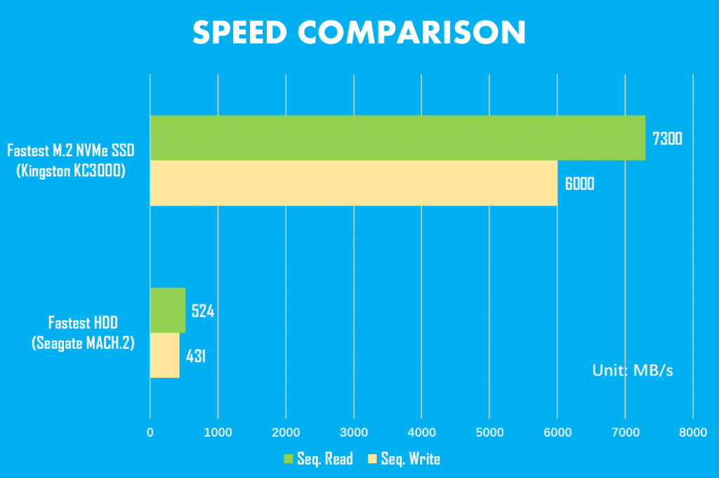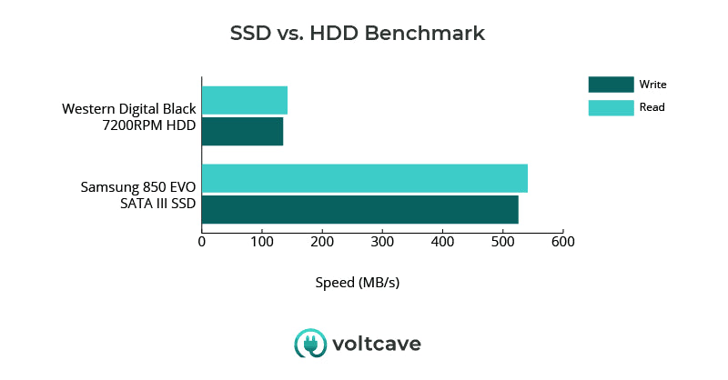 SSDs run faster and use less energy than HDDs. You can see this when you move large files. SSDs can copy files at upwards of 500 MBps. Newer SDDs can even go up to 3,500 MBps. On the other hand, HDDs only transfer at 30–150 MBps.
